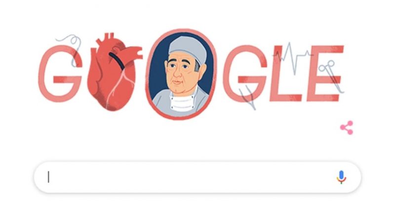 Los doodles de Google son intervenciones artísticas con las que se reemplaza el logo del buscador en ocasiones especiales. En este caso, un corazón y una caricatura de la cara del reconocido cirujano reemplazan las “o” de Google; mientras que a su alrededor se pueden ver elementos típicos de la medicina: un bisturí, la imágen que muestra el latido de un corazón en un electrocardiograma y unas tijeras.