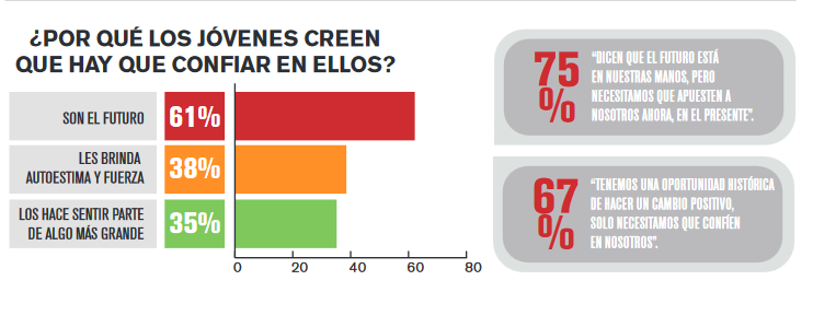 Las conclusiones destacaron que el 89% de los jóvenes encuestados remarcó la necesidad de que la sociedad confíe en las capacidades y talentos de su generación, aunque apenas un tercio de ellos considera que esto realmente sucede. Gran parte de los argentinos participantes de la encuesta sostuvieron la importancia de apostar por los jóvenes hoy, no sólo en un futuro (75%), y de recibir reconocimiento por sus logros (77%).