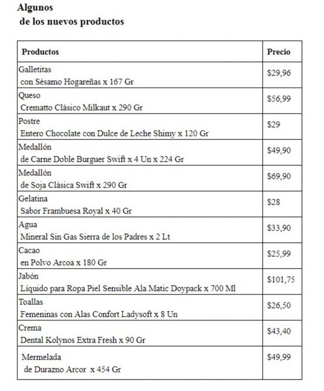 En la nueva lista se incorporan opciones de agua mineral, mermeladas, galletitas, gaseosas, yerbas, fideos, yogures y quesos crema, entre otros, y se mantienen las ofertas de productos sin TACC. También estarán disponibles en más de 73 sucursales mayoristas de las cadenas Yaguar, Makro, MaxiConsumo y Nini que abastecen a comercios de proximidad de todo el país.