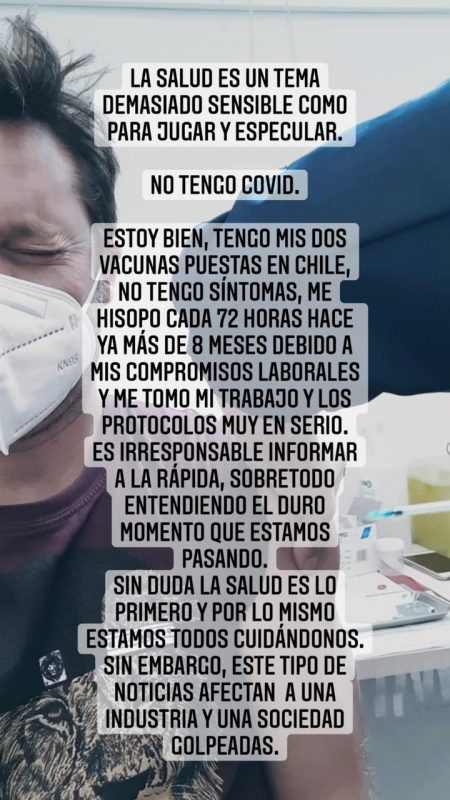 “Estoy bien, tengo mis dos vacunas puestas en Chile, no tengo síntomas, me hisopo cada 72 horas hace ya más de ocho meses debido a mis compromisos laborales y me tomo mi trabajo y los protocolos muy en serio”, narró firme la pareja de la China Suárez.