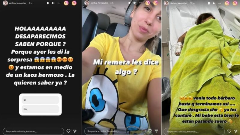 El domingo 21 por la tarde, Cinthia publicó una historia que decía: “Venía todo bárbaro hasta que terminamos así… Qué desgracia che. Ya les contaré. Mi bebé está bien, le están pasando suero“, explicó la mamá de Charis, Bella -de 8 años- y Francesca -de7- sin brindar más detalles sobre qué pasó.