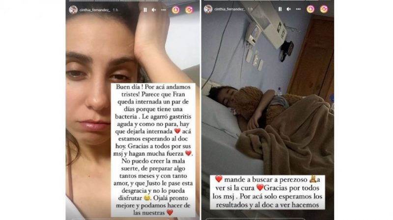 “Buen día. Por acá andamos tristes! Parece que Fran queda internada un par de días porque tiene una bacteria”, comenzó Cinthia un mensaje que publicó en su las historias de su cuenta de Instagram.