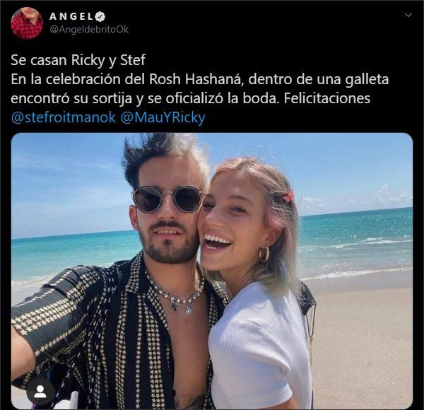 Así lo informó el conductor de Ángeles de la Mañana, a través de una publicación en la red social Twitter: “Se casan Ricky y Stef“, comenzó diciendo. Y prosiguió: “En la celebración del Rosh Hashaná, dentro de una galleta encontró su sortija y se oficializó la boda. Felicitaciones“.