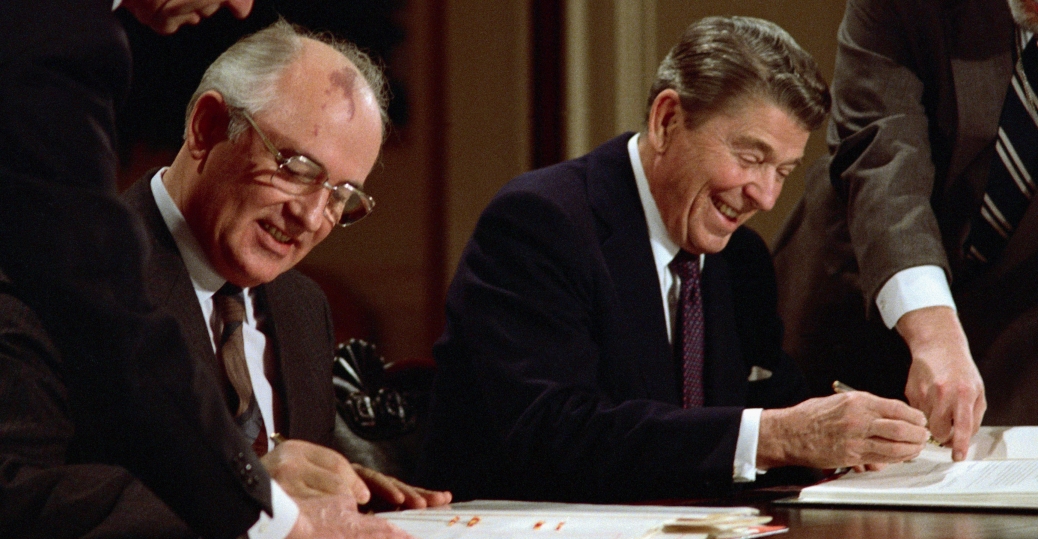 1987 – Ronald Reagan y Mijaíl Gorbachov (foto), líderes de los Estados Unidos y de la U.R.S.S. respectivamente, firman un tratado que prohibía las fuerzas nucleares de alcance intermedio.