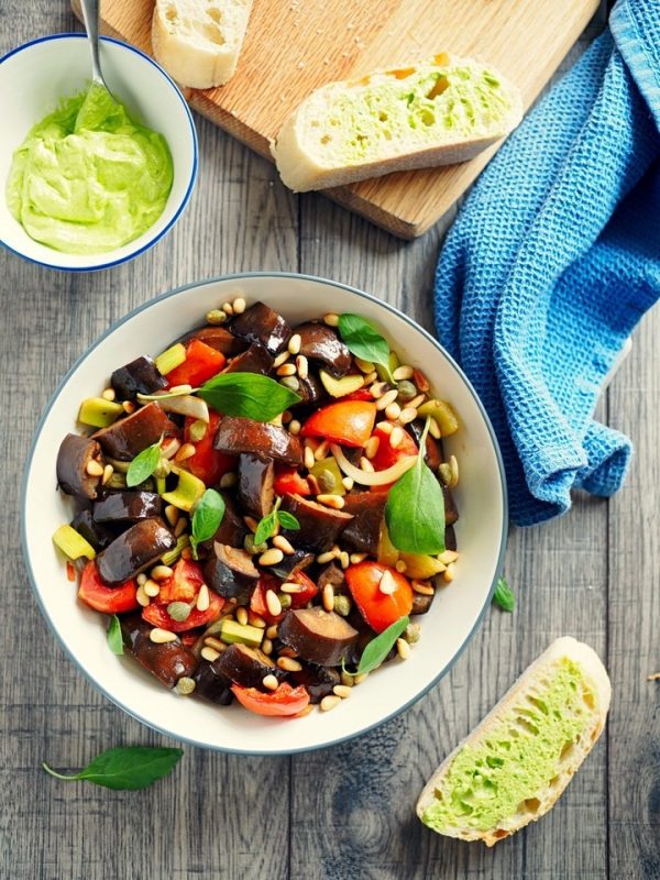Pelar las berenjenas, cortarlas en cubos. Colocarlas en un colador y espolvorear sal gruesa durante una hora para que suelten el agua. Enjuagarlas y escurrirlas bien. En una sartén, colocar una cucharada de aceite de oliva y calentar. Saltearlas en tandas, hasta que queden bien selladas de cada lado.