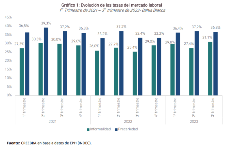 El Centro Regional de Estudios Económicos de Bahía Blanca (CREEBBA) explicitó que “la tasa de precariedad se ubicó en 36,8% (aproximadamente 55.155 individuos)”.