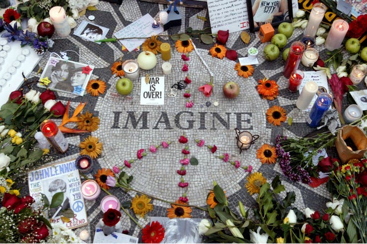 Memorabilia en un círculo con la palabra Imagine para honrar al difunto John Lennon en Strawberry Fields de Central Park en Nueva York