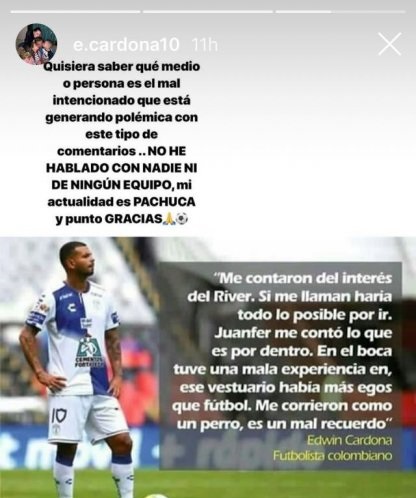 “Me contaron del interés de River. Si me llaman haría todo lo posible por ir. Juanfer me contó lo que es por dentro. En Boca tuve una mala experiencia. En ese vestuario había más ego que fútbol. Me corrieron como un perro, es un mal recuerdo”, dice la foto, a lo que Cardona responde: “Quisiera saber qué medio o persona el el mal intencionado que está generando polémica con este tipo de comentarios… no he hablado con nadie ni de ningún equipo, mi actualidad es Pachuca y punto. Gracias”, cerró Edwin.