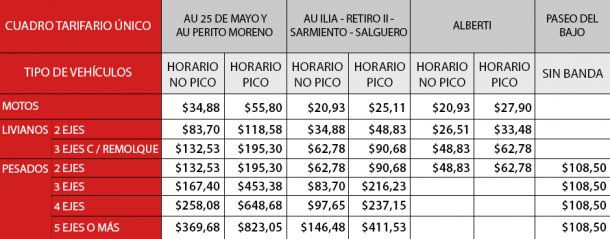Así las cosas, hoy el peaje con 10% de rebaja por el TelePase es de $76,50 en la hora pico en las autopistas 25 de Mayo y Perito Moreno, y el costo ahora se irá a $118,50. En los momentos de menor circulación será de $ 83,70. En la Illia, en tanto, la hora pico con Telepase costará $ 48.80 y la no pico $ 34,87.