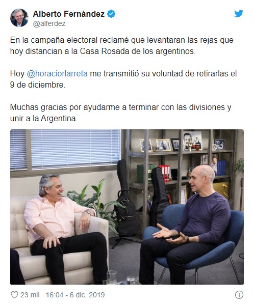 “En la campaña electoral reclamé que levantaran las rejas que hoy distancian a la Casa Rosada de los argentinos. Hoy @horaciorlarreta me transmitió su voluntad de retirarlas el 9 de diciembre. Muchas gracias por ayudarme a terminar con las divisiones y unir a la Argentina”, escribió Alberto el día 6 de diciembre.