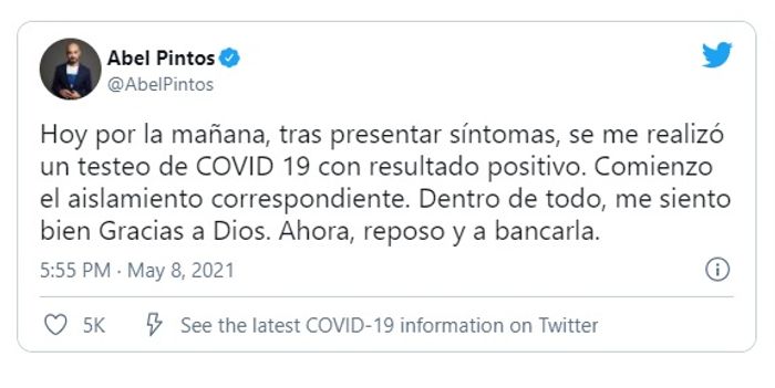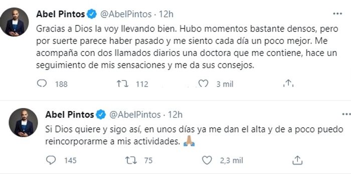 En la noche de viernes, Abel comentó vía Twitter cómo está transitando la enfermedad: “Gracias a Dios la voy llevando bien. Hubo momentos bastante densos, pero por suerte parece haber pasado y me siento cada día un poco mejor“.