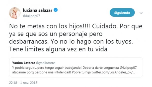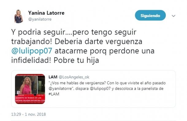 Cuando el ida y vuelta tomó notoriedad, Yanina respondió por Twitter dando a entender que tenía más información sobre las relaciones de Salazar. Sin embargo, en medio de su respuesta hizo referencia a Matilda, la hija de la modelo: “Y podría seguir… ¿Pero tengo seguir trabajando! Debería darte vergüenza @lulipop07 ¡Atacarme porque perdone una infidelidad! Pobre tu hija”, lanzó la panelista.