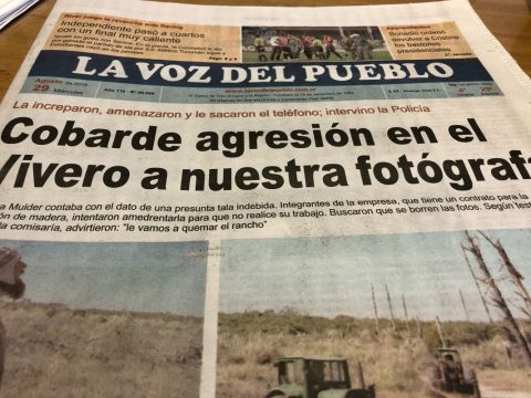 Carolilna Mulder, fotógrafa del diario de La Voz del Pueblo en Claromecó, fue agredida por representantes de la empresa encargada del raleo en el Vivero de ese balnearia, cuando se disponía a tomar algunos registros de una tarea al parecer irregular por parte de obreros de la firma concesionaria.