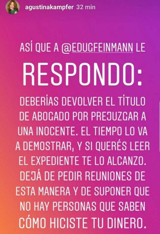 Furiosa, la panelista de Incorrectas le respondió desde Instagram. “Deberías devolver el título de abogado por prejuzgar a una inocente, el tiempo lo va a demostrar, y si querés leer el expediente te lo alcanzo. Dejá de pedir reuniones de esta manera y de suponer que no hay personas que saben cómo hiciste tu dinero“.