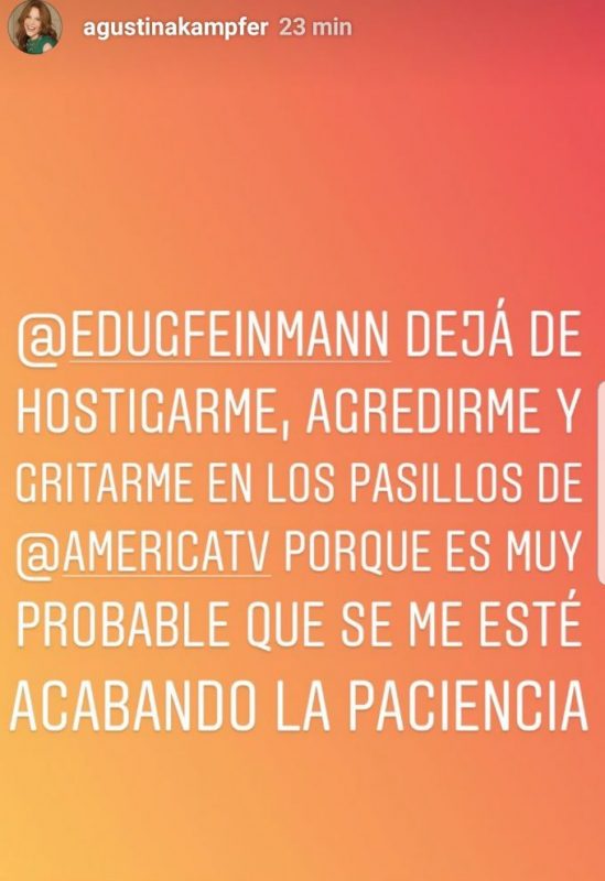 Además, Kämpfer le hizo una advertencia: “Eduardo Feinmann dejá de hostigarme, agredirme y criticarme en los pasillos de América porque es muy probable que se me esté acabando la paciencia“.