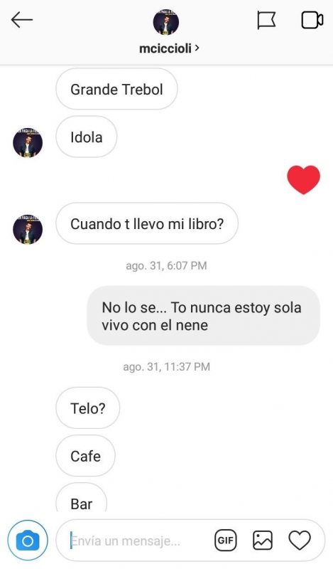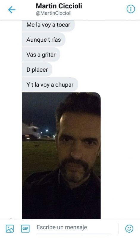 Los diálogos con la Trébol son recientes, ya que el periodista le contó que la denuncia que Nieves Jaller había hecho estaba ‘toda armada’: “Confirmo que es él porque me hacía lo mismo y me decía lo mismo. El video es distinto, no se lo pasaba a otras. Me contactaron varias chicas porque le hicieron lo mismo. No me parecía atractivo Ciccioli en los videos. ¿A quién le calienta que te manden un video sacando la lengua?”. (Diario Show)