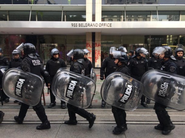 “Fuera Mauricio Macri”, “Macri gato” y “Fuera FMI”, fueron algunas de las frases que pintaron personas encapuchadas con aerosol en la entrada del lugar. Además, tiraron bombas de pinturas a la fachada y rompieron vidrios.