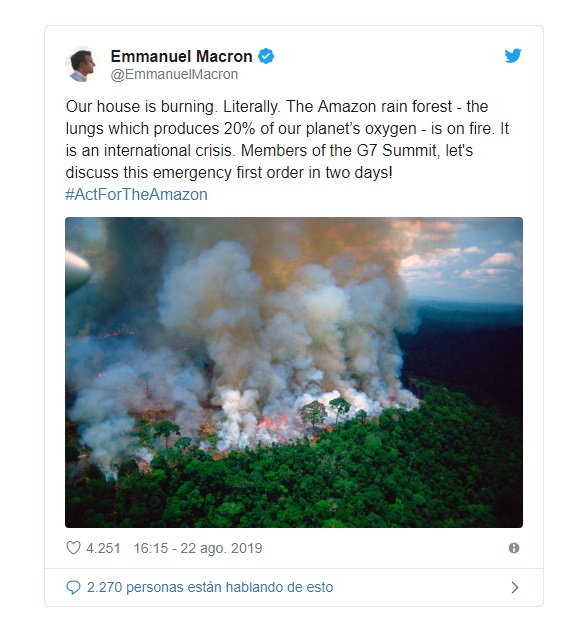 El mandatario destacó que la selva amazónica produce el 20 por ciento del oxígeno del planeta. “Es una crisis internacional”, advirtió y pidió a sus pares del G7 que traten de emergencia el tema durante la cumbre que se realizará en la ciudad francesa de Biarritz en dos días.