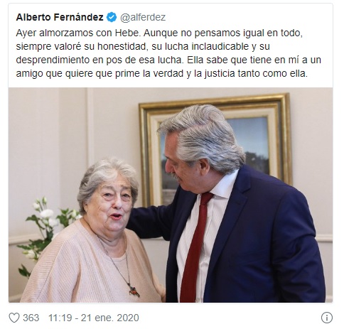 A través de una publicación en su cuenta de Twitter, Fernández dio a conocer el encuentro: “Ayer almorzamos con Hebe. Aunque no pensamos igual en todo, siempre valoré su honestidad, su lucha inclaudicable y su desprendimiento en pos de esa lucha”.