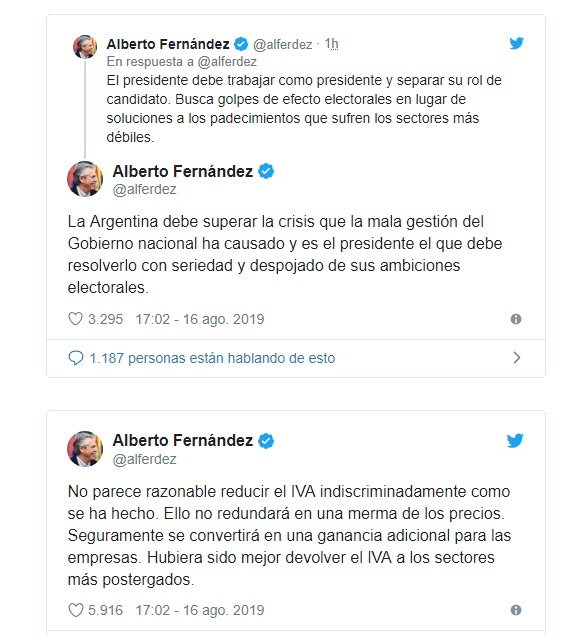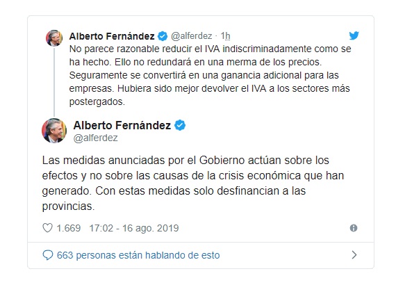 El candidato a presidente por el Frente Para Todos Alberto Fernández criticó las medidas tomadas por el Gobierno tras la crisis que provocó en la economía el resultado de las PASO y apuntó de manera directa a la quita del IVA en alimentos de la canasta básica.