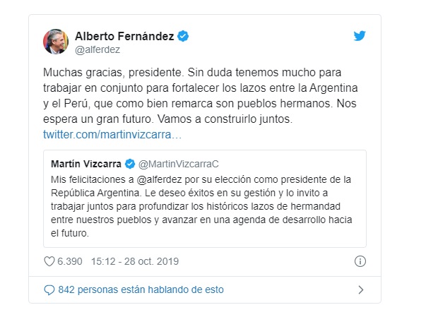 Tras saber los resultados oficiales de los comicios en nuestro país, el presidente Martín Vizcarra escribió en su cuenta de la red social Twitter: “Mis felicitaciones a @alferdez por su elección como presidente de la República Argentina. Le deseo éxitos en su gestión y lo invito a trabajar juntos para profundizar los históricos lazos de hermandad entre nuestros pueblos y avanzar en una agenda de desarrollo hacia el futuro”.