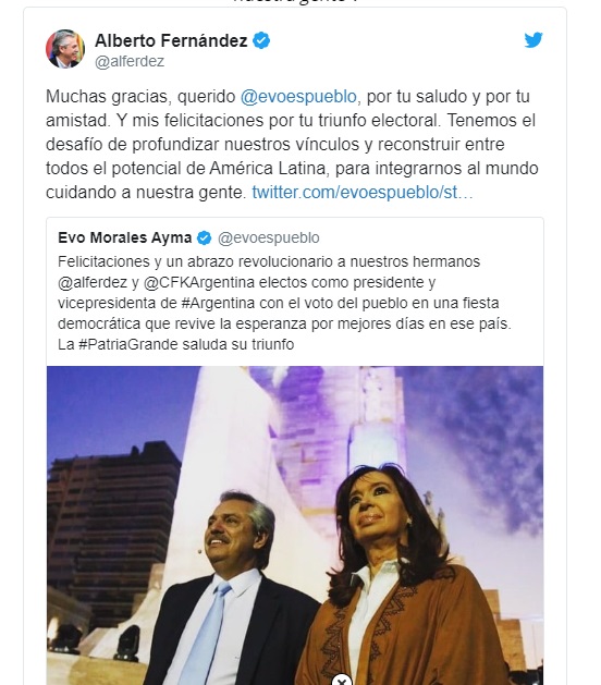 Por su parte, Evo Morales , el presidente de Bolivia escribió: “Felicitaciones y un abrazo revolucionario a nuestros hermanos @alferdez y @CFKArgentina electos como presidente y vicepresidenta de #Argentina con el voto del pueblo en una fiesta democrática que revive la esperanza por mejores días en ese país. La #PatriaGrande saluda su triunfo”.