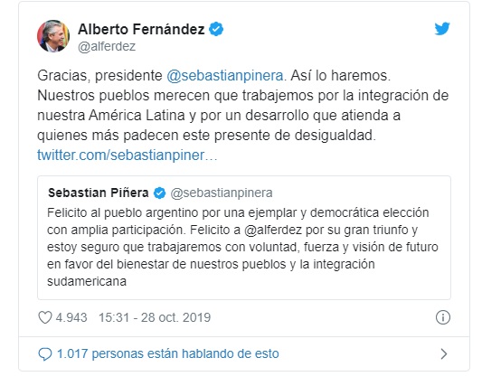 A lo que Fernández replicó: “Gracias, presidente @sebastianpinera. Así lo haremos. Nuestros pueblos merecen que trabajemos por la integración de nuestra América Latina y por un desarrollo que atienda a quienes más padecen este presente de desigualdad.”