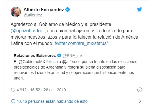 Más tarde, el perfil de Relaciones Exteriores del Gobierno de México expresó: “El @GobiernoMX felicita a @alferdez por su triunfo en las elecciones presidenciales de Argentina y reitera su plena disposición para renovar los lazos de amistad y cooperación que históricamente nos unen”.