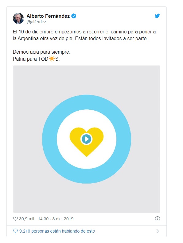 Fernández dijo que “el 10 de diciembre empezamos a recorrer el camino para poner a la Argentina otra vez de pie. Están todos invitados a ser parte”.
