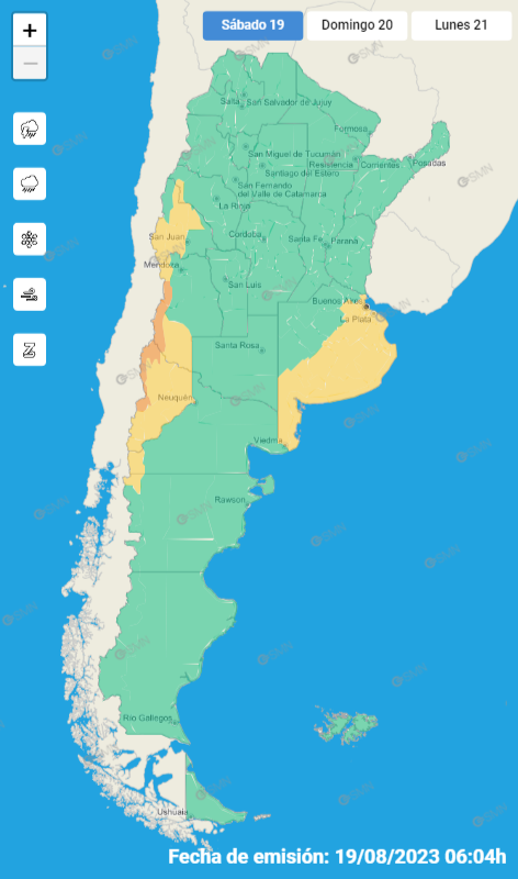 El Servicio Meteorológico Nacional (SMN) emitió esta mañana un alerta naranja por nevadas para la zona cordillerana de Mendoza y Neuquén y otro de nivel amarillo por vientos para gran parte de la provincia de Buenos Aires, CABA, Neuquén y Mendoza; mientras que en San Juan y La Rioja es por viento Zonda.