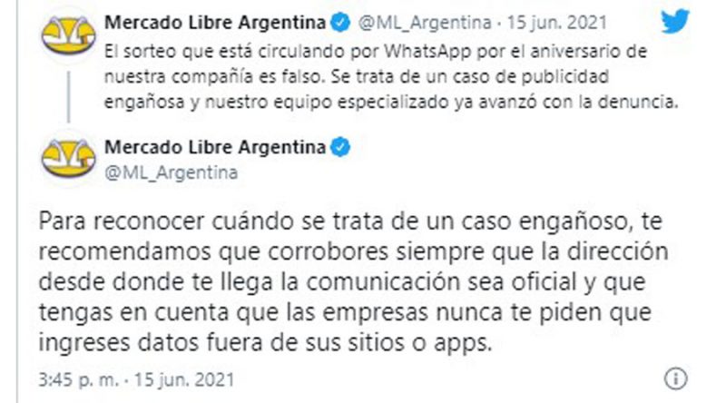 Mercado Libre tuvo que salir a desmentir el mensaje en sus redes sociales, al igual que en marzo pasado. “El sorteo que está circulando por WhatsApp por el aniversario de nuestra compañía es falso. Se trata de un caso de publicidad engañosa y nuestro equipo especializado ya avanzó con la denuncia”, escribieron en Twitter.