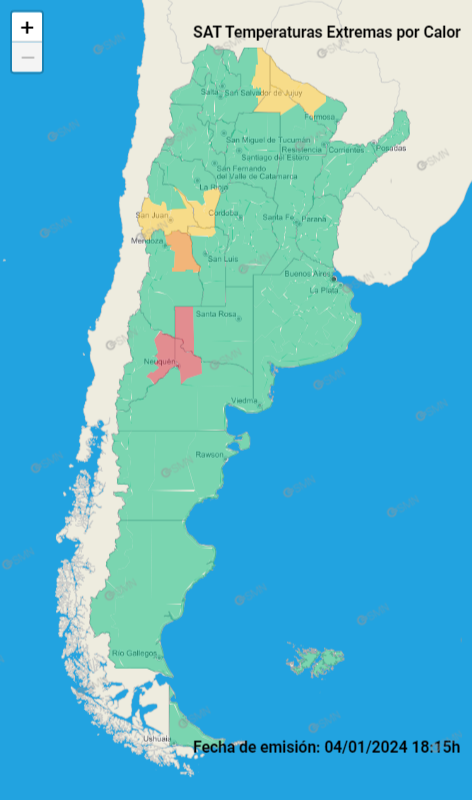 Localidades del oeste de La Pampa, este de Neuquén y norte de Río Negro se encuentran bajo alerta roja por temperaturas extremas, con el nivel más alto de advertencia por calor, mientras que también rigen alertas naranjas y amarillas en zonas de otras siete provincias.