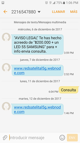 En todos los casos junto al mensaje se adjunta una página www.redsatelital5g.webnode.com en la cual figura un número telefónico diferente, haciendo todo más confuso.