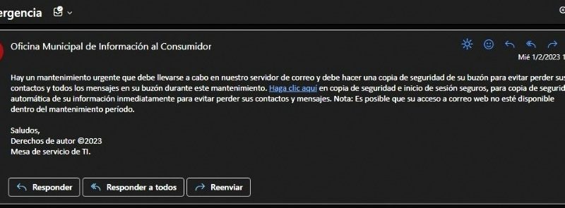 La Oficina Municipal de Información al Consumidor de Bahía Blanca comunica que, tanto en el día de ayer, martes 31 de enero, como hoy por la mañana, se ha emitido un correo electrónico “phishing” desde su e-mail oficial omic@bahia.gob.ar .
