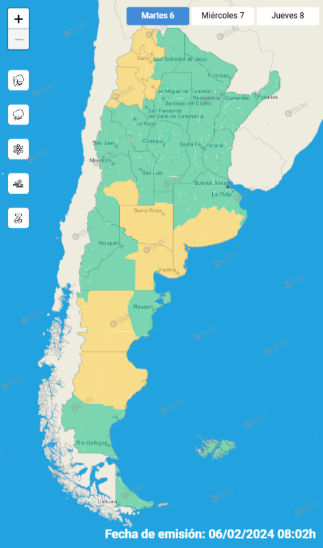 Por otro lado, para este martes a la noche y la mañana del miércoles se encuentra vigente un alerta amarillo por viento para el oeste y centro de Chubut, en Sarmiento, el sudoeste de Florentino Ameghino y las mesetas de Cushamen, Futaleufú, Languiñeo, Tehuelches, Escalante y de Río Senguer.