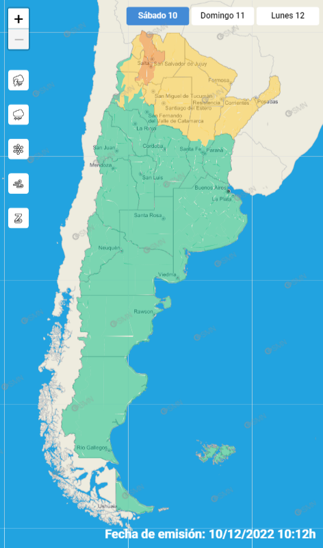 Por otro lado hay alerta amarillo por tormentas para las localidades de Puna de Tinogasta, Puna de Antofagasta de la Sierra, Puna de Belén, Puna de Cafayate, Puna de San Carlos, Puna de Santa María y Puna de Tafí del Valle, en Catamarca.