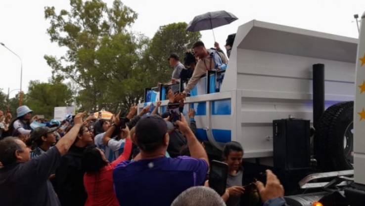 Arriba de un camión decorado con los colores patrios y banderas de Argentina, el mediocampista surgido de la cantera de Argentinos Juniors y con pasado en Boca Juniors saludó y celebró junto a todos los pampeanos durante su travesía hacia la gobernación, donde mantendrá un encuentro privado con Sergio Raúl Ziliotto.