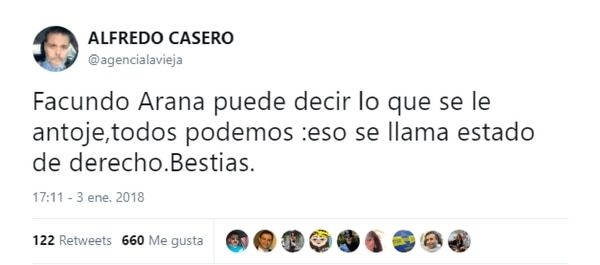 “Facundo Arana puede decir lo que se le antoje. Todos podemos: eso se llama estado de derecho. Bestias”, escribió Casero en un primer mensaje. “A ver si se creen ser la policía del pensamiento ajeno, débiles”, agregó.