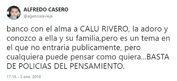“Banco con el alma a Calu Rivero. La adoro y la conozco a ella y a su familia, pero es un tema en el que no entraría públicamente. Pero cualquiera puede pensar como quiera. Basta de policías de pensamiento”, escribió al respecto.