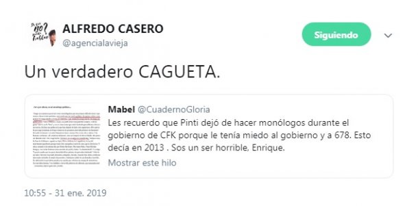 Tras estos dichos, Alfredo Casero salió con los tapones de punta y sin piedad contra su colega: “(Es) un verdadero cagueta”, tuiteó a raíz de una publicación de una usuaria con una antigua entrevista donde Pinti contaba que durante el gobierno de Cristina Fernández de Kirchner había dejado de hacer monólogos por temos a 6,7,8 y la AFIP. “Yo a los de 678 me los fumo y fumare en pipa”, agregó Casero. (Rating Cero)