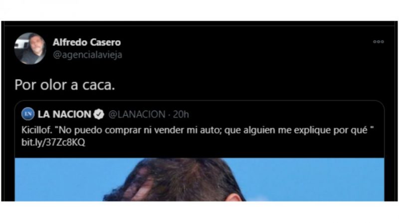 Por olor a caca”, escribió el actor anti K en Twitter para fundamentar el motivo por el cual el político no puede vender su automóvil, aunque también compartió una encuesta para que sus seguidores voten.