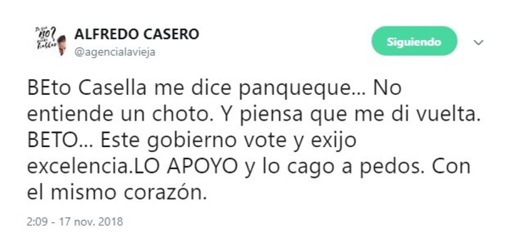 Quizás por eso, Beto Casella lo trató de “panqueque” y el humorista estalló de ira en Twitter. “Beto Casella me dice panqueque… No entiende un choto. Y piensa que me di vuelta. BETO… (A) este gobierno voté y exijo excelencia. LO APOYO y lo cago a pedos. Con el mismo corazón“, expresó el artista.
