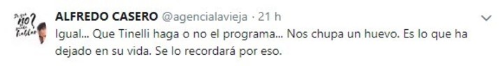 “Igual… Que Tinelli haga o no el programa… Nos chupa un huevo. Es lo que ha dejado en su vida. Se lo recordará por eso”, manifestó el polémico actor en su cuenta de Twitter, en la que lo siguen más de 500.000 usuarios. (Clarín)