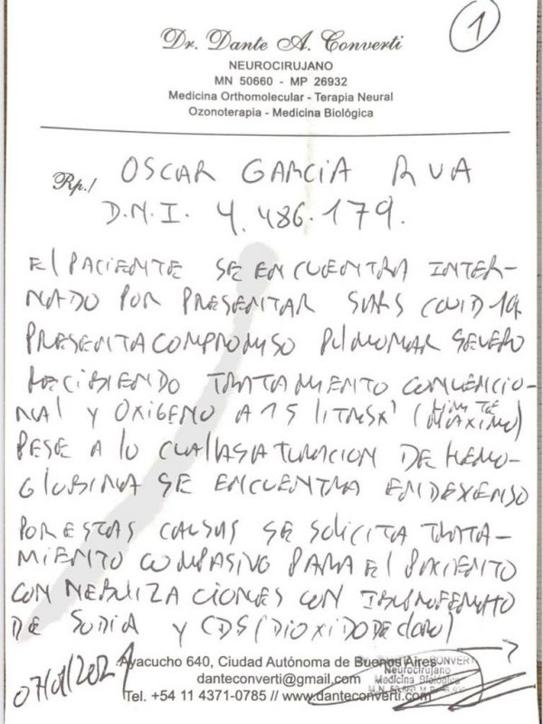 Esta semana, el Juez Federal Subrogante Javier Pico Terrero hizo lugar al pedido de la familia de Oscar Jorge García Rúa, un hombre de 93 años que estaba internado en el hospital Otamendi con coronavirus. El hijastro del paciente presentó la solicitud firmada por un médico para que le apliquen dióxido de cloro a su padre, y logró la aprobación de Pico Terreno, quien aseguró que “la cobertura de los tratamientos indicados no ocasionaría un grave perjuicio para la demandada, pero evita, en cambio, el agravamiento de las condiciones de vida de la actora”. El hombre finalmente falleció y generó una serie de repudios por parte del cuerpo médico.