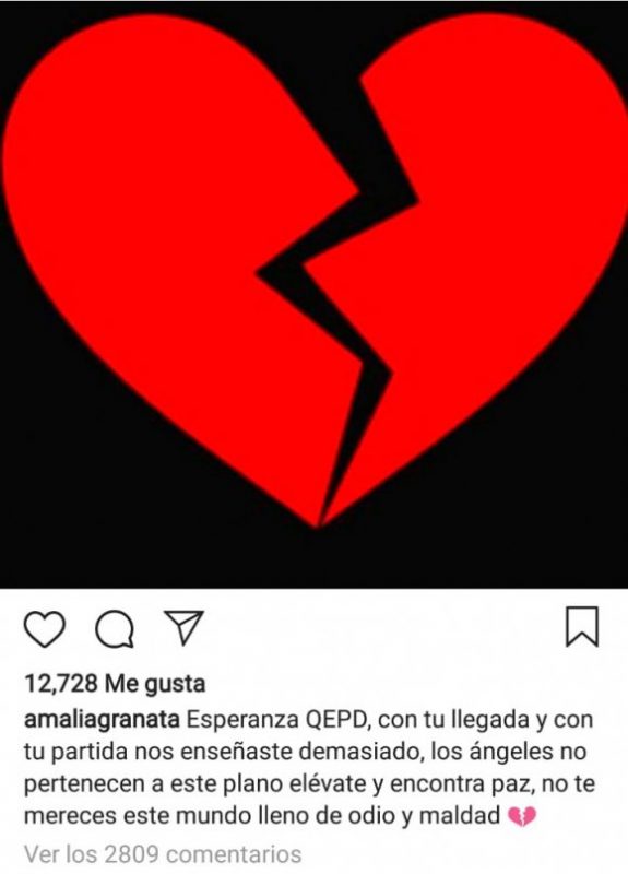 Indignada por lo ocurrido, Amalia Granata, ferviente opositora a la legalización del aborto en la Argentina, compartió un mensaje en Instagram, con la imagen de un corazón roto. “Esperanza QEPD. Con tu llegada y con tu partida nos enseñaste demasiado. Los ángeles no pertenecen a este plano. Elevate y encontrá paz, no te merecés este mundo lleno de odio y maldad”, escribió la periodista, visibilizando sus sentimientos ante la triste noticia.