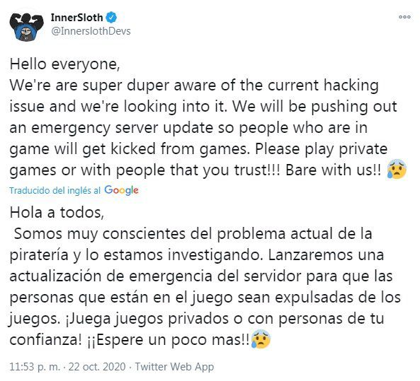 “Somos muy conscientes del problema actual de la piratería y lo estamos investigando. Lanzaremos una actualización de emergencia del servidor para que las personas que están en el juego sean expulsadas de los juegos”, informaron desde InnerSloth y pidieron a todos los jugadores que realicen partidas privadas con amigos o personas de confianza.