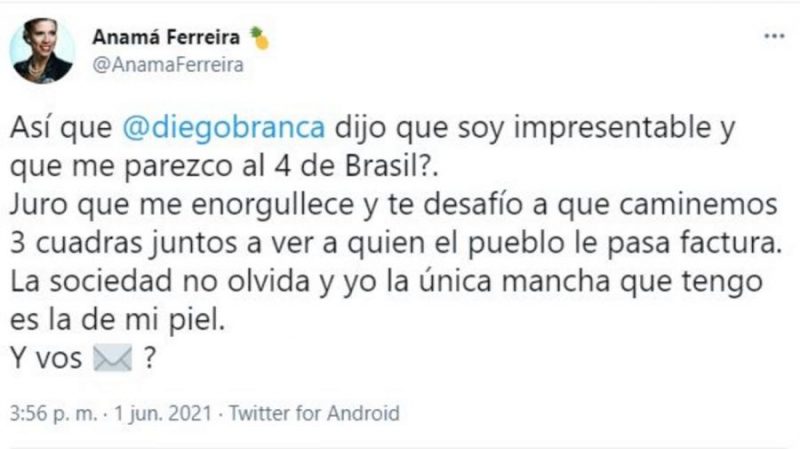 Luego de su cruce con Diego Brancatelli en Twitter, Anamá Ferreira visitó “Los Ángeles de la Mañana”, programa en el que recibió una fuerte respuesta por parte del periodista K y en donde ella redobló la apuesta con picantes declaraciones.
