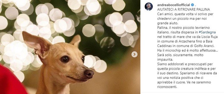 Finalmente, Bocelli usó su Instagram para despedir a su mascota y agradecer el apoyo. «Queridos amigos, siguiendo los últimos informes, es hora de aceptar que hay un hueco en nuestro corazón», comenzó el cantante en relación al galgo perdido en Cerdeña.