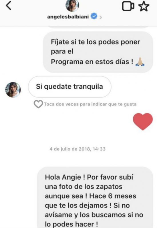 Junto a la captura de varios chats, el conductor de Los Ángeles de la Mañana primero mandó al frente a Ángeles Balbiani. “Hola @angiebalbiani te reclaman la promoción o devolución de un par de zapatos. Copate“, lanzó desde Twitter.