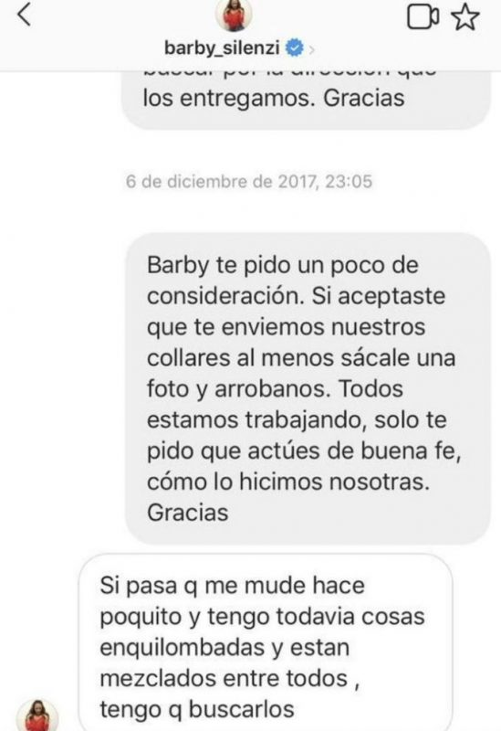 Luego, Ángel fue por Barby Silenzi, y la calificó de “rata” por haber recibido seis collares, y tampoco hacer la promoción en las redes. “Poneles el post @barbydilenzi. No seas rata! 6 collares te dieron!!! Copate!“, escribió junto a los chats de la bailarina con la persona que le mandó los accesorios.